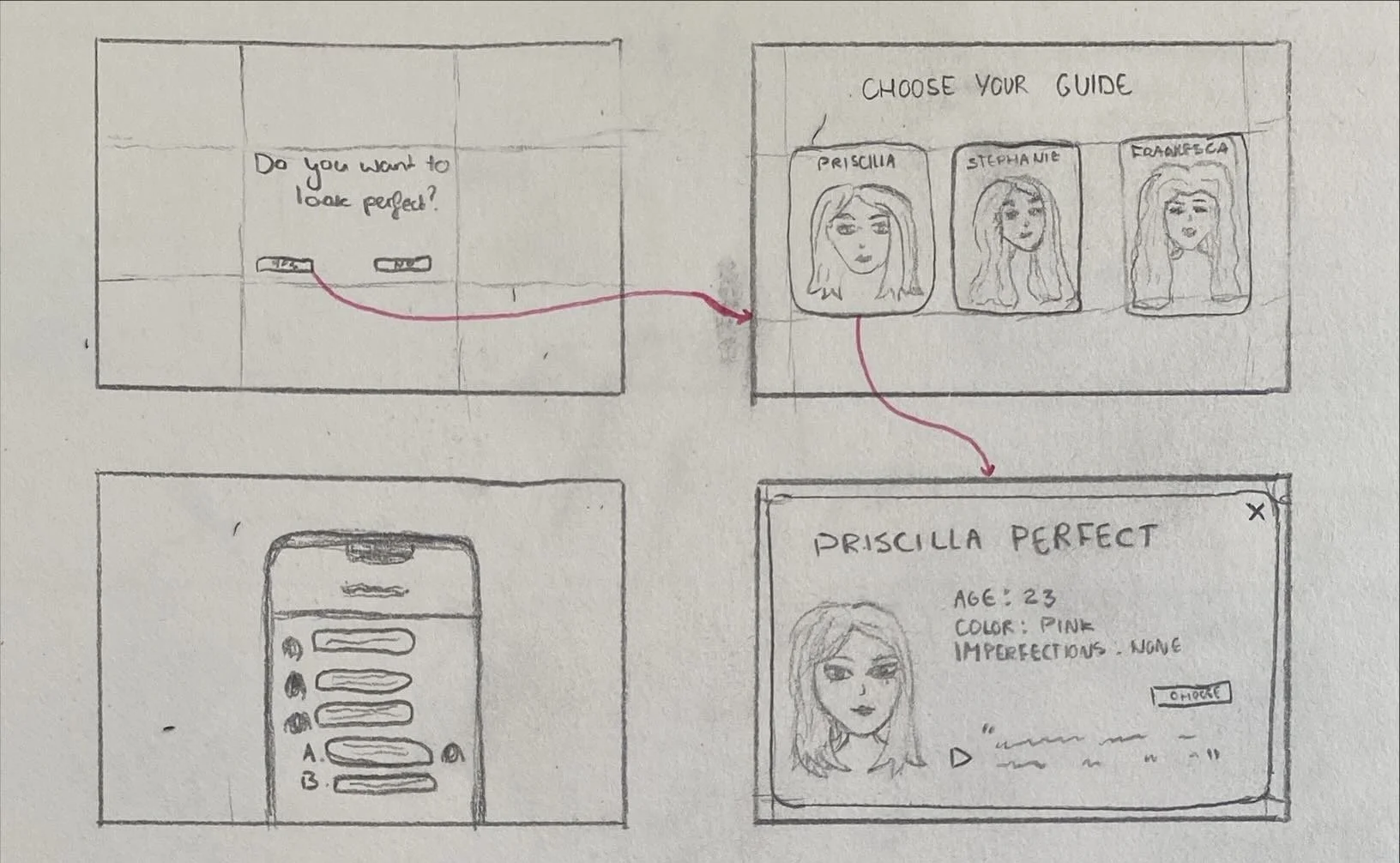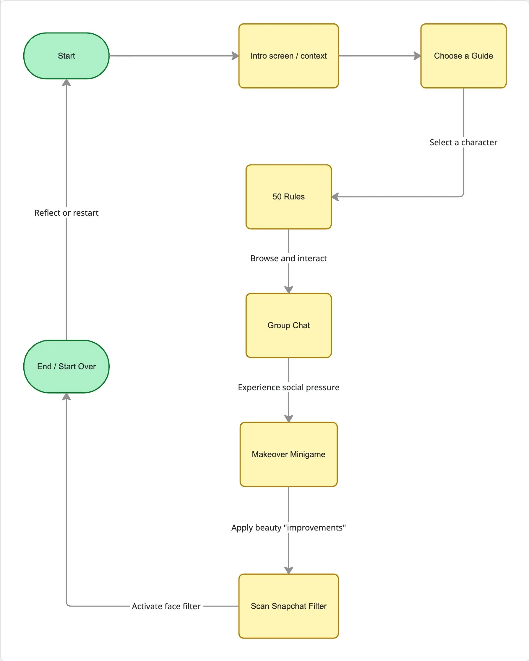I wanted to transform this problem into an ironic guide that walks you through the rules of perfection. At the beginning of the interface, you can choose your own guide to lead you through the interface. The interface itself consists of several different components: a list of 50 rules for perfection, a group chat where the user can reply, a makeover minigame, and a filter that changes your face.