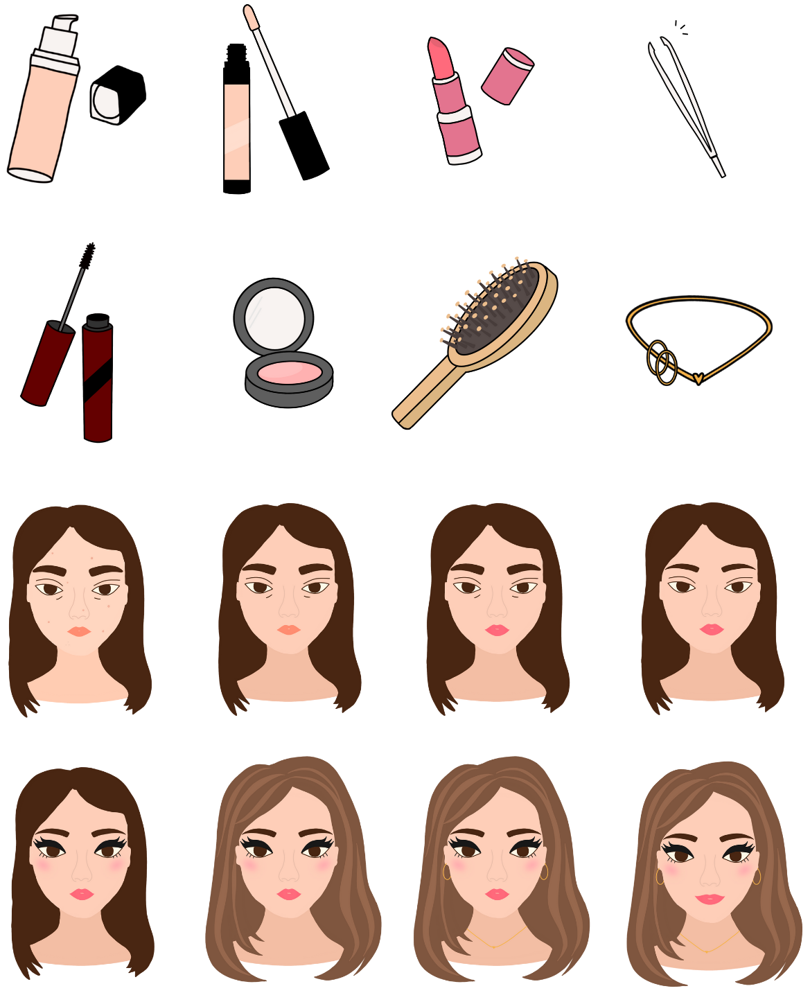 Makeover Minigame: a playful interactive game where users apply hair styling, makeup, and accessories, and see how it changes.
