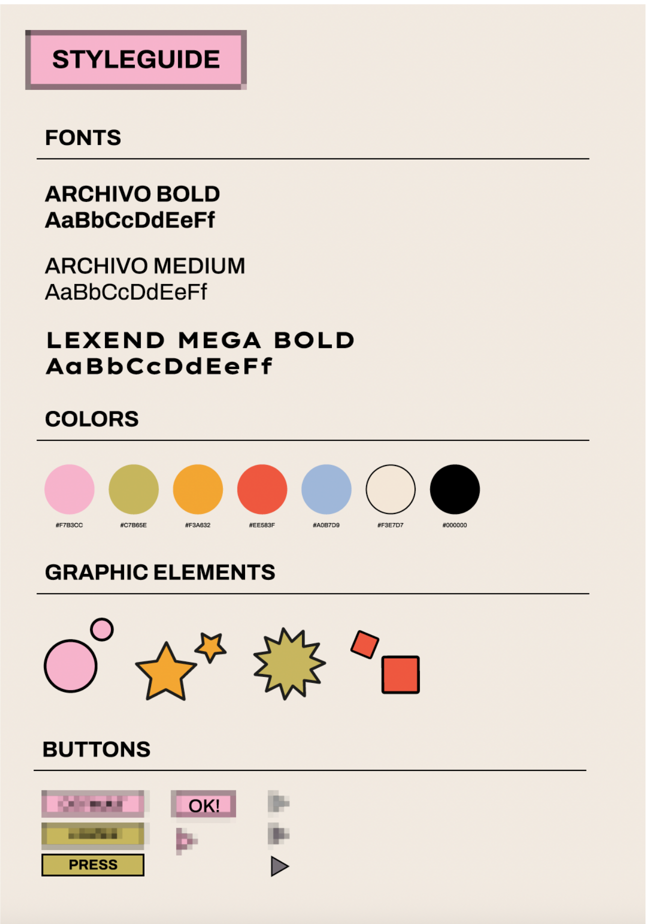 The overall visual style is based on the trendy Neo Brutalism aesthetic. When selecting typography, I looked for fonts that matched this style while also working well within Figma. During my visual research, I used a style cheat sheet as inspiration and selected two fonts that felt both expressive and readable. I intentionally limited the design to only two typefaces, as the style itself is already quite bold and visually busy. Using fewer fonts helped keep the interface structured and easy to read.